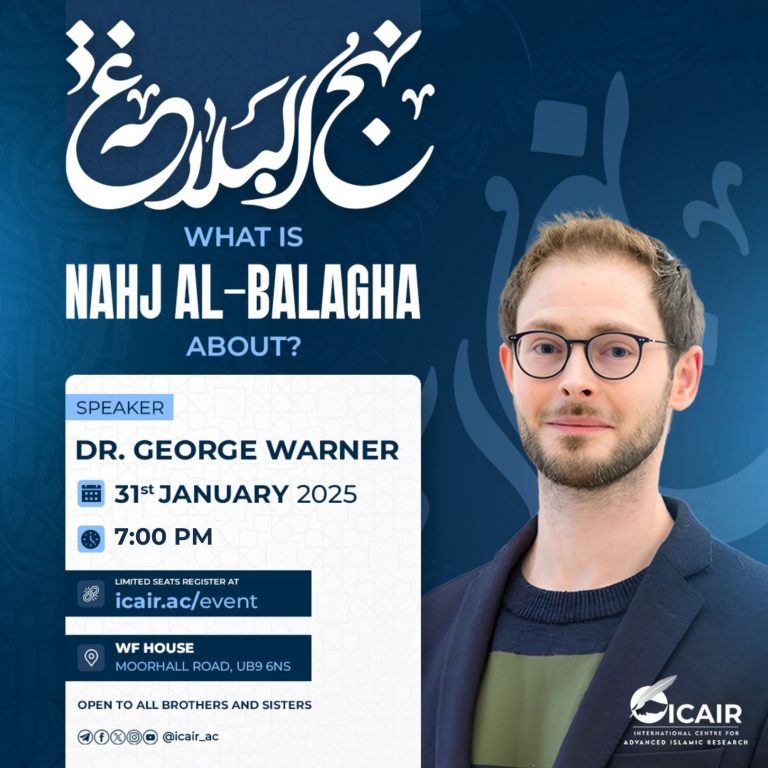What isn’t Nahj al-Balagha about? Commanding, as it does, such immense reverence as a repository of Imam Ali’s (as) words, the variety of texts within Nahj and the commentaries written upon it over a millennium have invited this book to speak to an almost boundless range of realities, thoughts and experiences. These near-universals, nevertheless, are paired with specifics. Nahj collects some texts about the Imam and excludes others; it emphasises some topics at the expense of others; it was collected by a particular scholar, al-Sharīf al-Raḍī, at a particular time, in a particular way; indeed, it is emphatically different to other collections of the Imams’ words written during the same period. What do these specifics tell us about the nature of the text and the aims of its compiler? Join the International Centre for Advanced Islamic Research (ICAIR) for a seminar with Dr George Warner that will locate Nahj al-Balagha in the context of its compilation, tracing the broader spectrum of how the Imams were remembered, represented and thought about. Focussing upon the ethical guidance that Nahj contains and the historical troubles that it narrates, we will try to understand the kind of encounter with the Imam that al-Raḍī sought to undertake – for himself and for his readers – and how his response to an era of such intense debate about the Imamate produced an account of Imam Ali (as) with such timeless appeal. Event Details: • Topic: What is Nahj al-Balagha About? • Date: Friday, January 31st, 2025 • Time: 7:00 PM • Location: WF House, Moorhall Road, UB96NS Dinner will be provided following the seminar, and free parking is available at the venue.